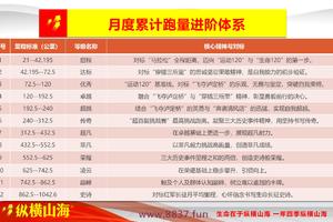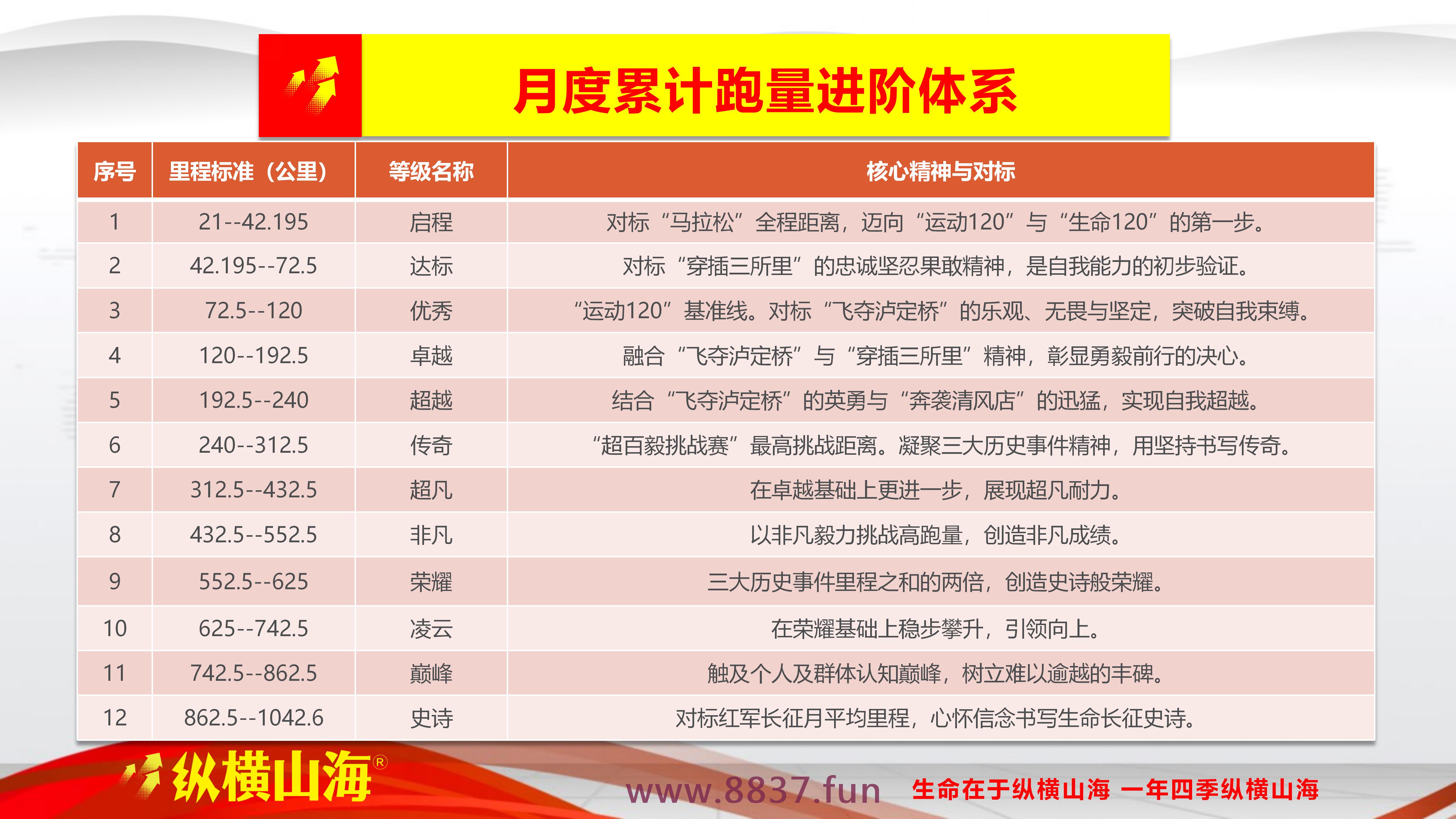 在纵横山海的生命长征运动体系中,每月累计跑量进阶目标体系,是我们的中期目标,将使我们的决策能耗降低72%,有效时间增加40%,默认网络活动减少65%。从而引领我们不断挑战自我能力的边界,遇见更好的自己。同时,这也是对“运动120”直至“生命120”的中国式现代化生活方式目标的生动践行。