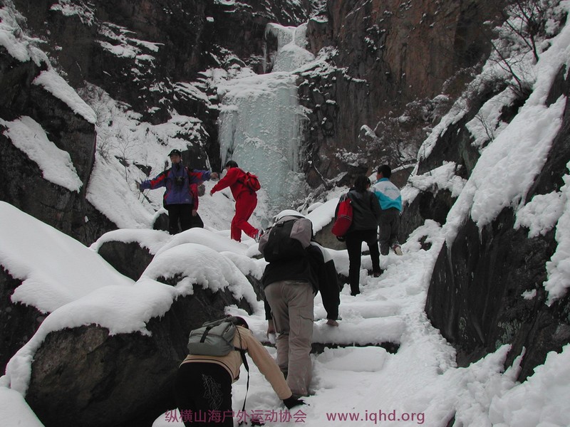 看北龙潭冰瀑布也可以从祖山镇直上祖山北门,然后从五道岭村前的六棵松山口下至北龙潭下。