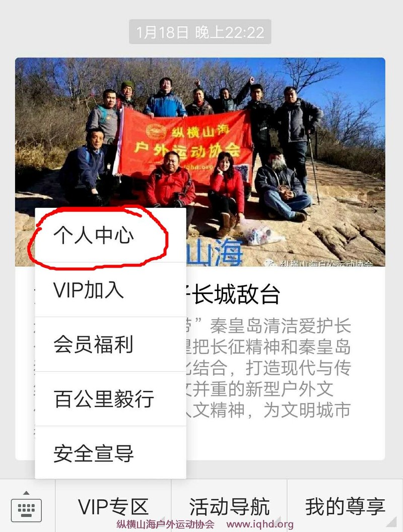 1、首先关注纵横山海户外运动协会服务号(扫描或者微信搜索iqhd100或纵横山海户外运动协会)