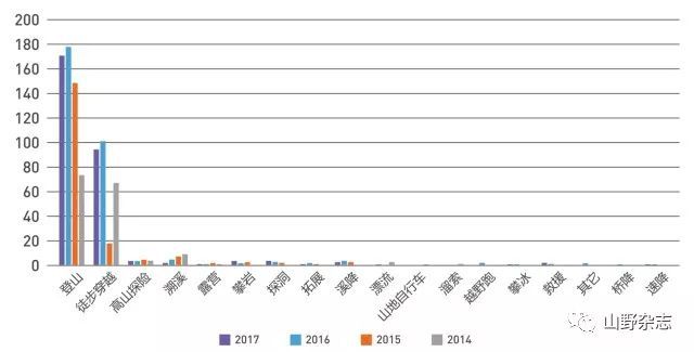此外,根据统计,高山探险项目在2017 年共发生4起事故,造成3 人死亡,与2016 年相比,死亡人数相同。