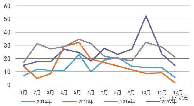 (蓝色:2014 ;橙色:2015 ;灰色:2016 ;紫色:2017 )