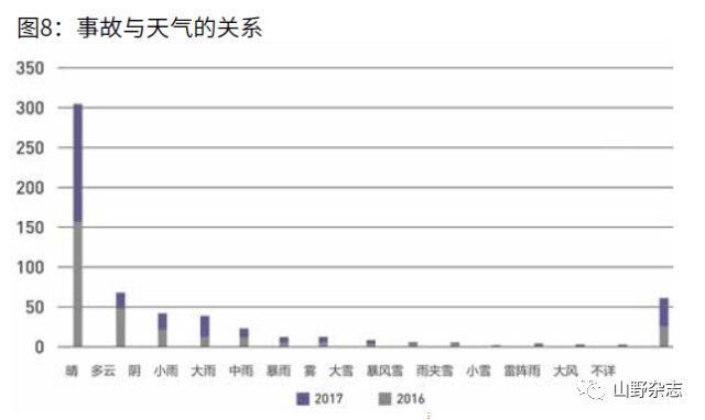 晴天的事故率远远高于其他天气,达51.2%,与2016 年相比,比例有所下降。难道晴天出行更危险?