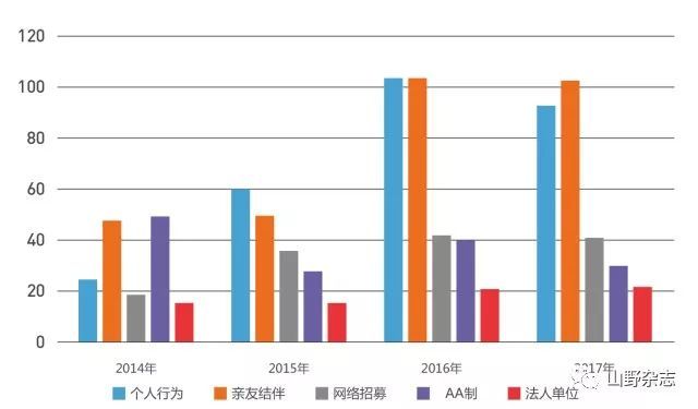 2017 年与往年相比,个人行为、亲友结伴的事故仍是年度事故多发的主要组织形式,占比67.82%,网络招募、AA 制、法人单位的事故基本保持稳定状态。由此可见,事故数量与组织形式密不可分。