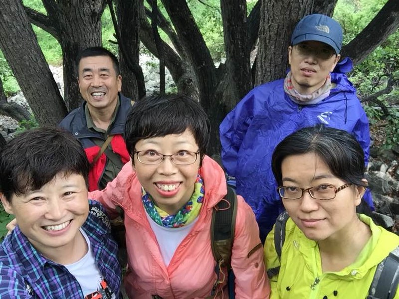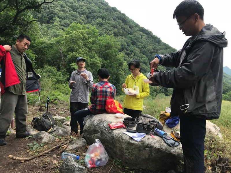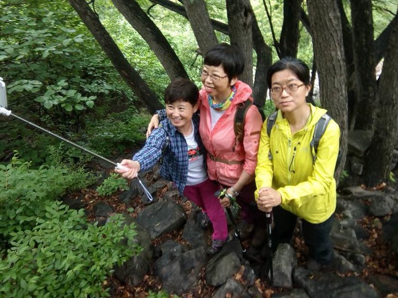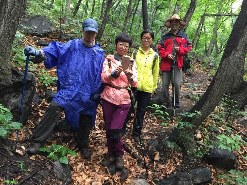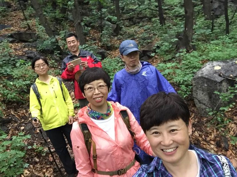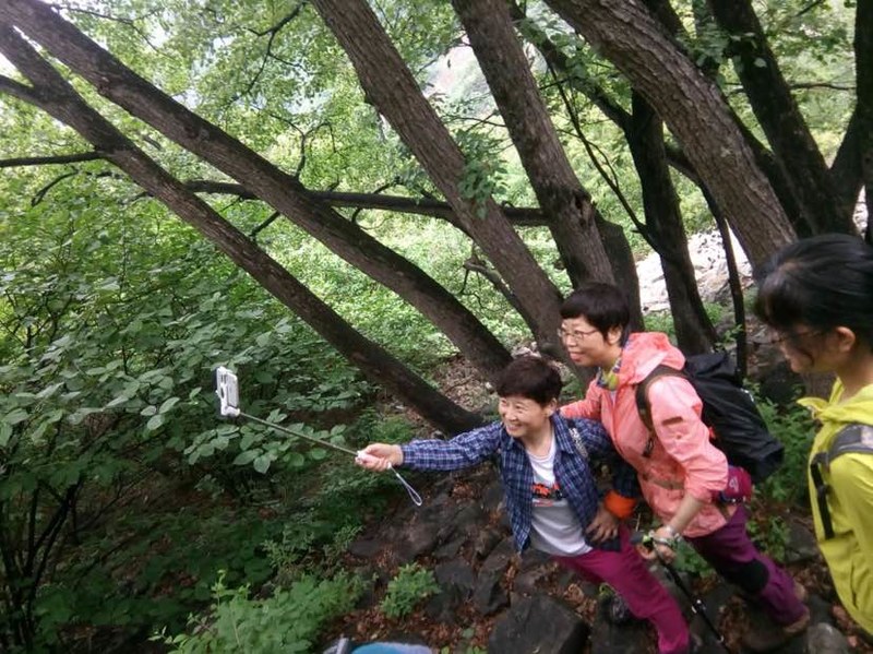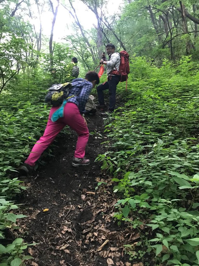 五个人谁都没来过,全凭感觉往山上走,不知究竟能不能看到天女木兰,也不知有多远,只知道一点半之前得返回去。目标感没那么强了,反而放松了,带着自拍杆的姐姐时不时给大家拍张合影,一路其乐融融。