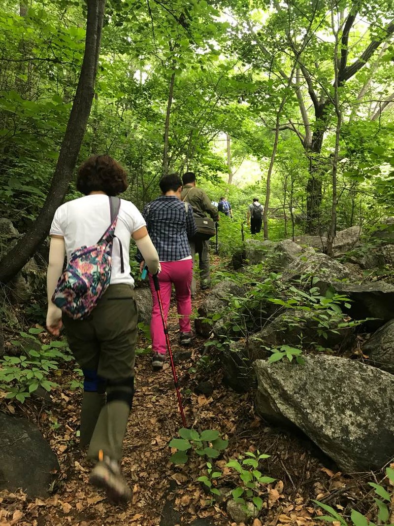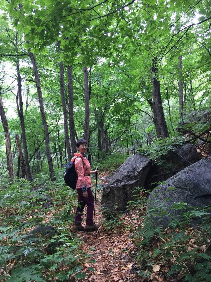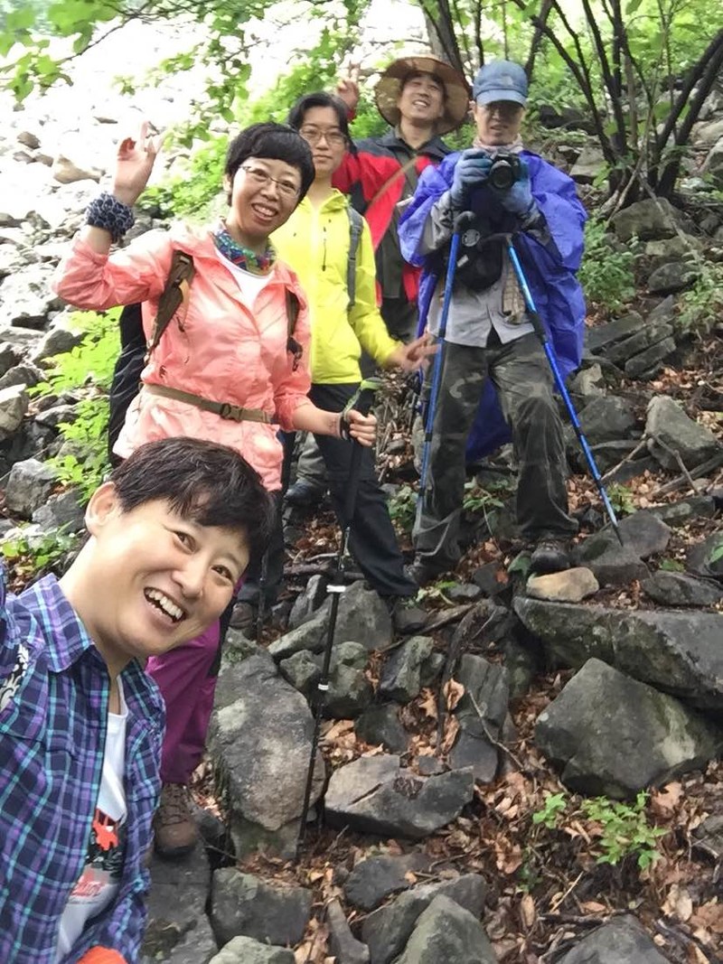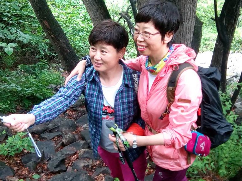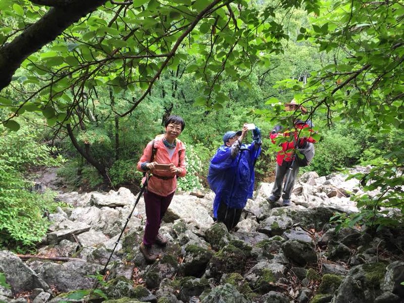 五个人谁都没来过,全凭感觉往山上走,不知究竟能不能看到天女木兰,也不知有多远,只知道一点半之前得返回去。目标感没那么强了,反而放松了,带着自拍杆的姐姐时不时给大家拍张合影,一路其乐融融。