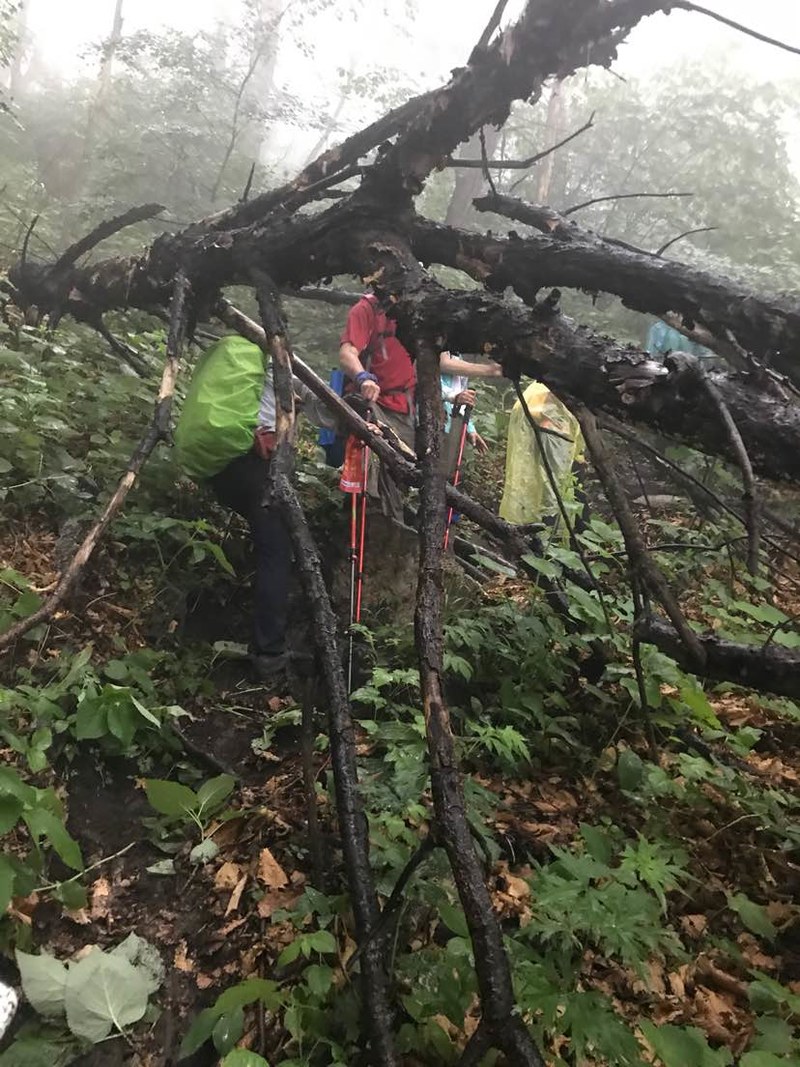 是这棵枯死倒伏在山路上的大树让我们最终铩羽而归。纵横被树下小陡坡滑摔,一只登山杖折断,一个眼镜片跌落,太危险了!雨后松软的山路瞬间泥泞不堪,一点点坡度就变成滑梯,不时有人摔倒,安全第一,还是原路返回山下吧。