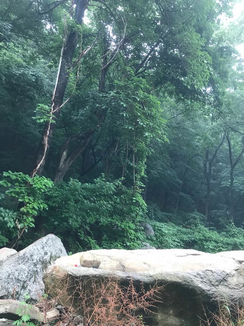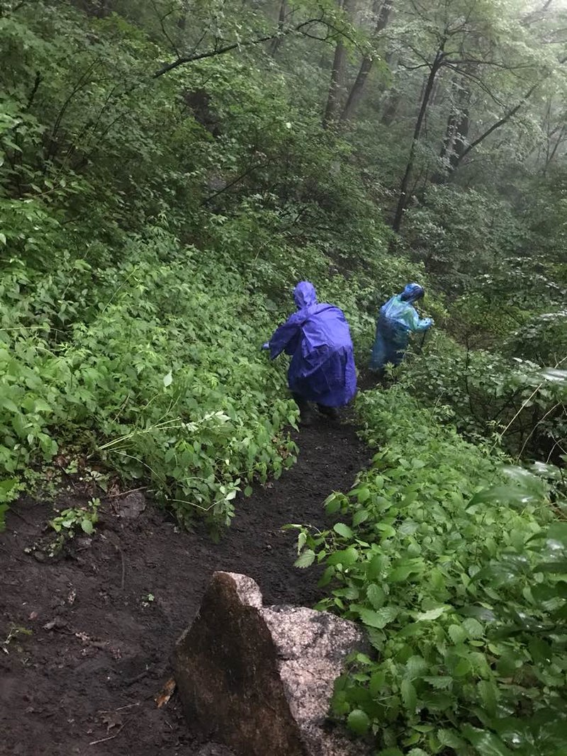 我和姐姐以及资深驴友纵横三个人躲在我带的一把伞下。呆了一阵儿见雨没有停的意思,纵横提议冒雨继续登顶。没有什么经验的我们,这种情况下当然唯纵横马首是瞻,跟在他身后,在雨中变得湿滑的山路上深一脚浅一脚地向山顶挺进。