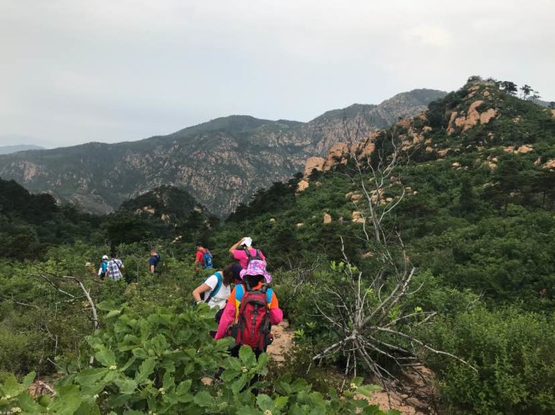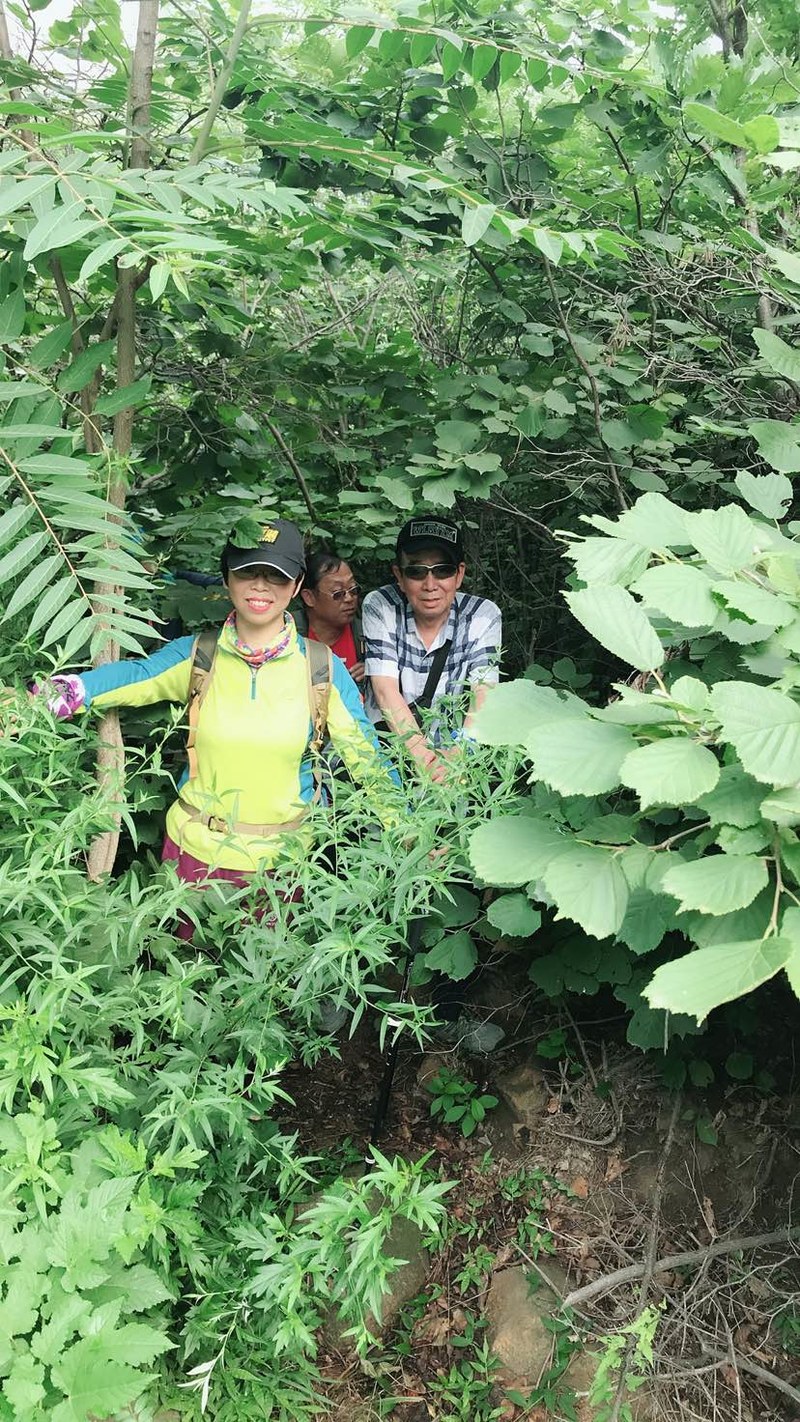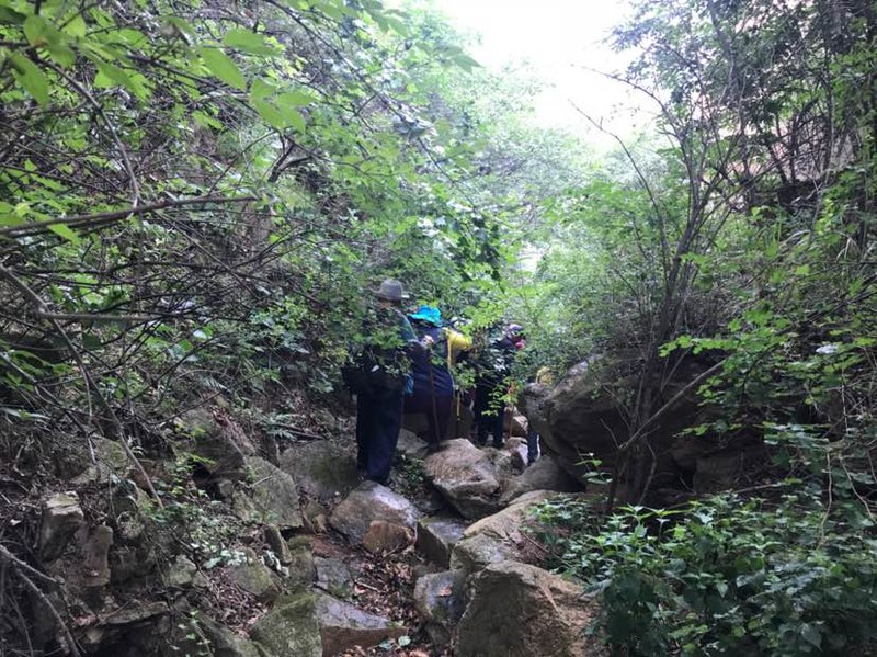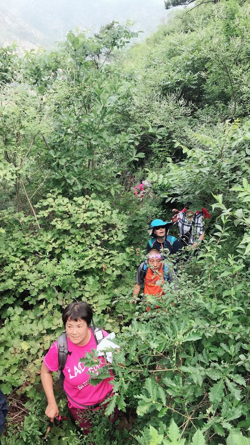 我们在一人多高的灌木丛中穿梭,初夏疯长的植物侵占了原本就不宽的羊肠小道,这时方显长袖T恤和长裤的重要,好多队友露在外面的胳膊、腿被滑得一道一道的,好在我捂得严实,可以阔步向前。
