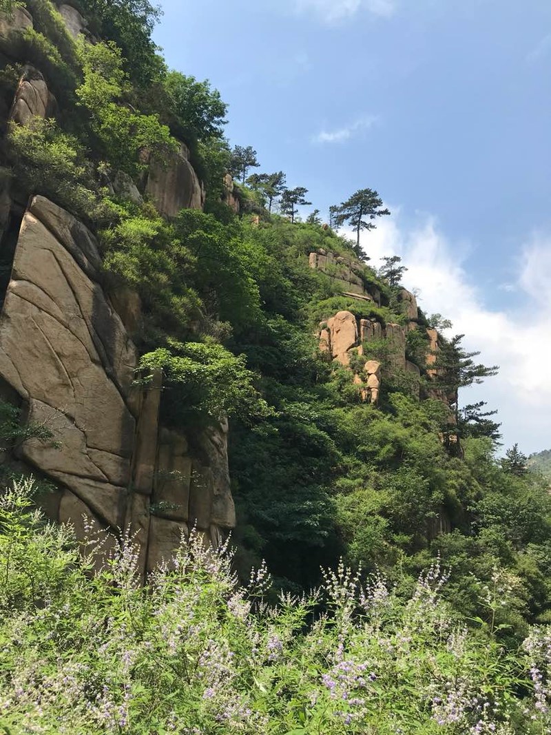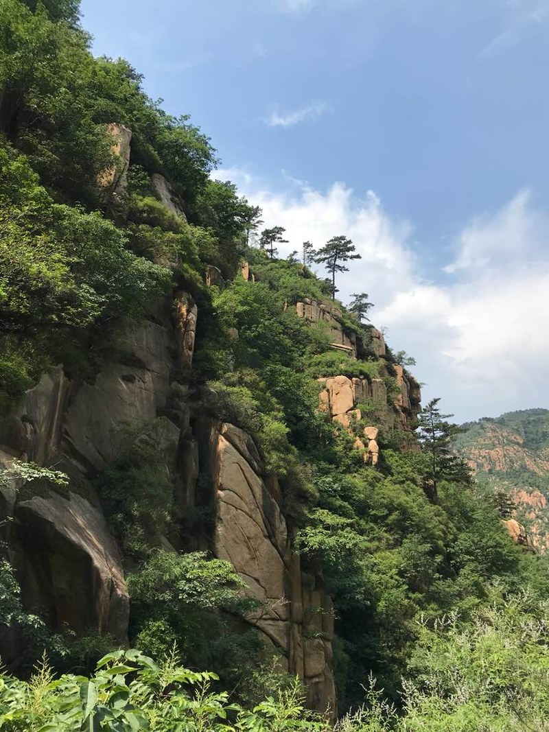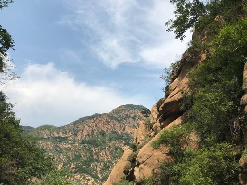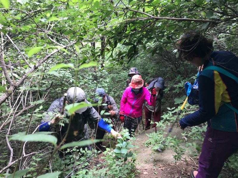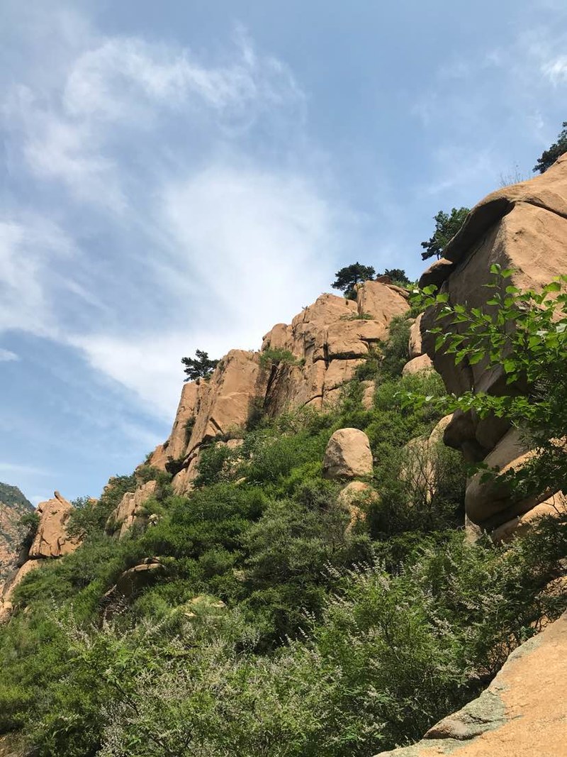 我们在一人多高的灌木丛中穿梭,初夏疯长的植物侵占了原本就不宽的羊肠小道,这时方显长袖T恤和长裤的重要,好多队友露在外面的胳膊、腿被滑得一道一道的,好在我捂得严实,可以阔步向前。