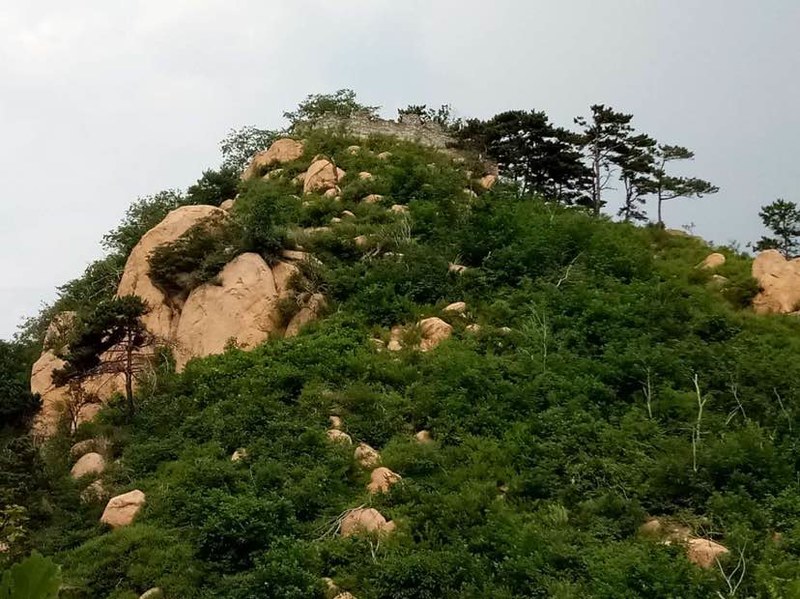 没怎么太费劲,已经遥遥看到位于山巅的八角楼了。大石窟村俗称"八角楼"的不规则八角形实心烽火台是万里长城线上的孤例。八角楼座落于背牛顶南面约四公里险峻的高山上,周围怪石林立,险峻无比,与自吴庄、苇子峪、柳观峪、孤石峪、温泉堡、方家河、马驿沟、大石窟至猩猩峪约25公里的弧形线的其它18座峰火台各据山头,遥相呼应,构成抚宁境内一道长城报警线。