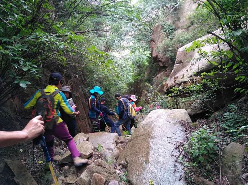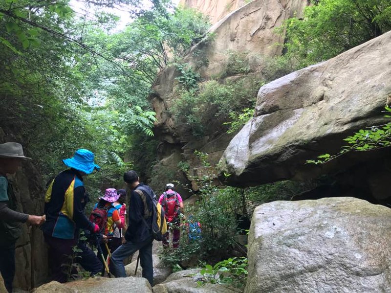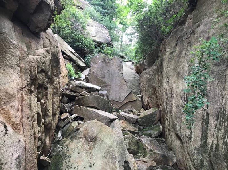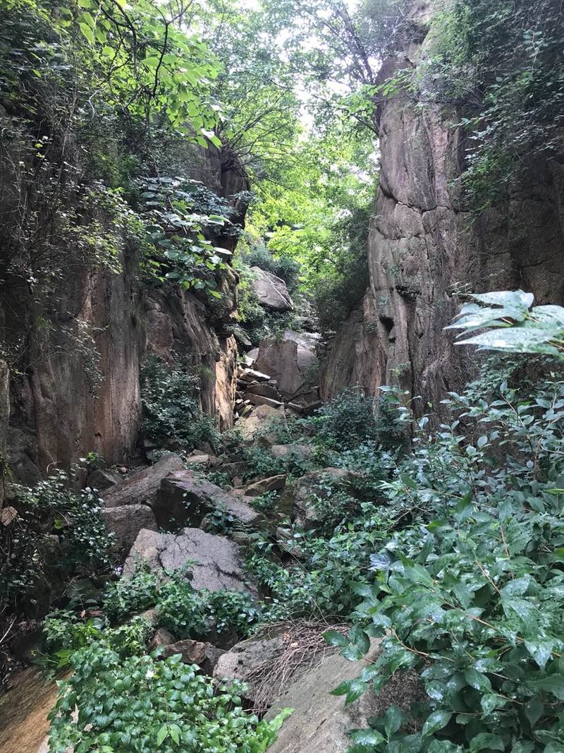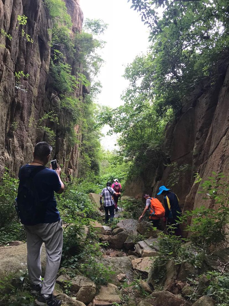 还好没原路返回,否则哪会看到这么美的峡谷。峡谷并不宽,两壁如刀削斧凿,谷中巨石林立,雨季山洪爆发时冲刷而成吧。现在枯水的初夏,就是我们驴友下山的通道,凉爽而壮美,奇景令我频频驻足,很快又落在队伍最后了,即便这样我也要多看几眼多拍几张,就算下次还会来,也不一定找得到这里,即便还走这里,也不会有完全相同的景致,此时此刻,流连于峡谷原生态的美。