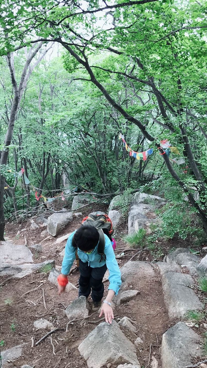 巨石上下来继续上行,坡度见陡,好多地方需抓着树枝藤蔓手脚并用。山上传来悦耳的佛音,路边有经幡飘扬。山边石缝乍现龙泉,水很清冽。