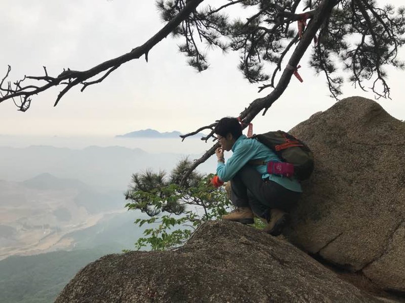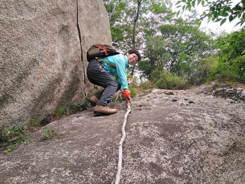 好多队友看完古松就折返回去了,我依然想登顶。路愈发艰难,简直艰难到没有路了。还好遇到一个独行的有丰富登山经验的白衣大哥,我和求实大哥与他结伴三人一起互相帮助拉扯着上到山顶,瞧,最难的光溜溜的巨石我们是拉着枯藤倒吸着凉气爬上去的。不到顶峰哪得赏如许风景啊!山下万顷绿色的海洋,远处云雾缭绕,视野所及皆奇峰,胸中豪气十足,一种与大自然雄浑之气的共鸣,一种追求自由天性的释放,令我陶醉。