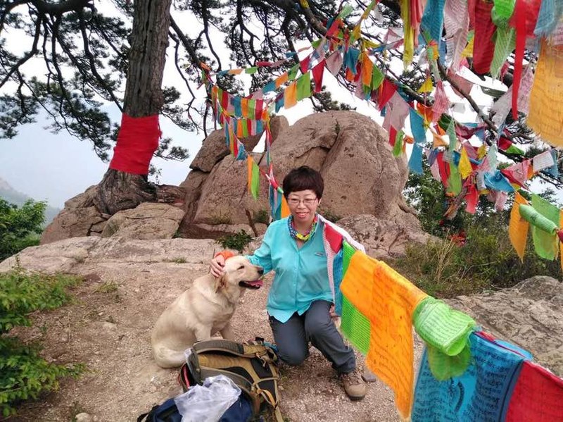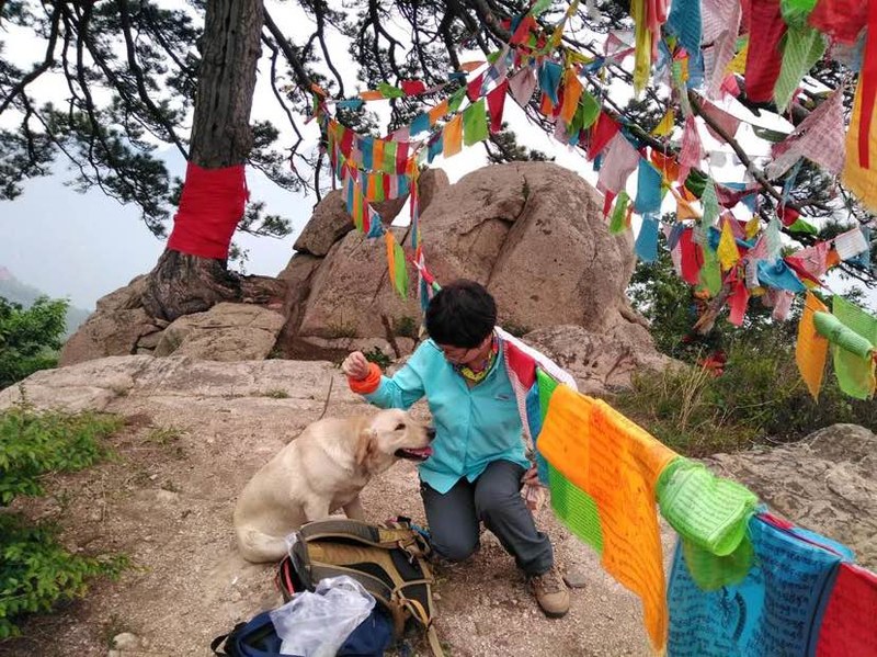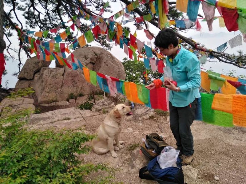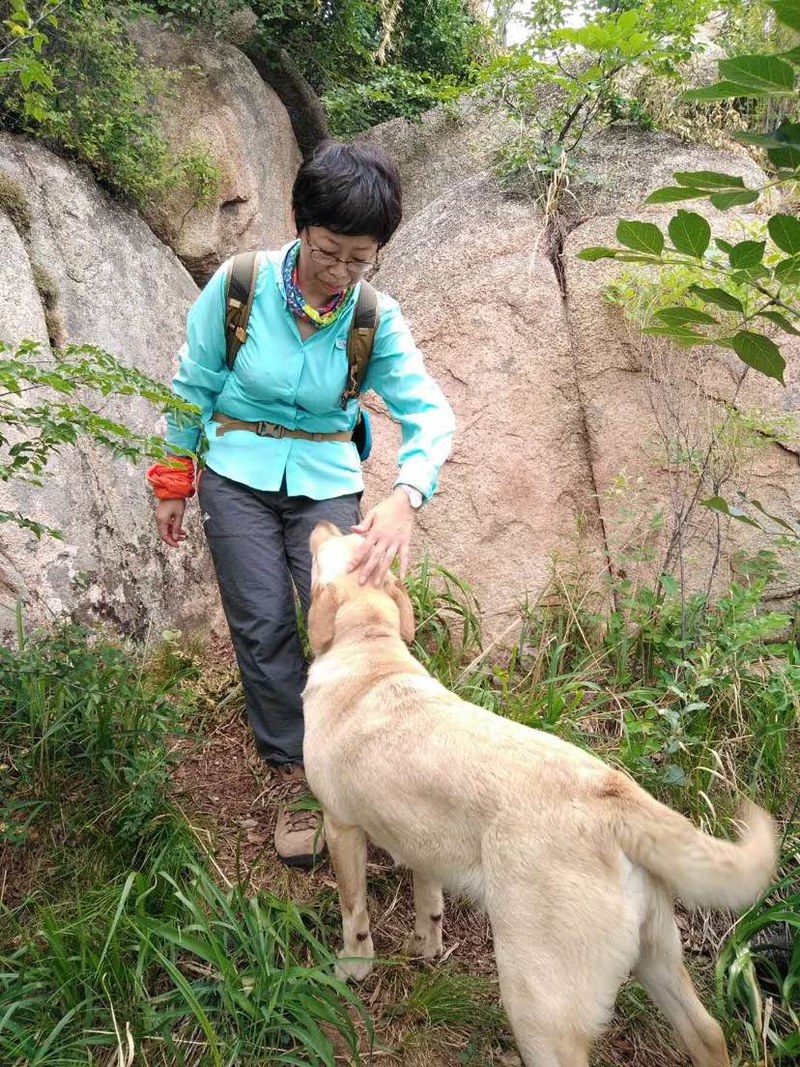 今天能登上山顶有一个功臣不得不表一表,就是这条一路给我们导游的大黄狗。路遇的夹着香烛贡品的大姐强掩神秘之色告诉我,她到山下村子里看"仙儿",是"仙儿"派这条狗给她们带路到山上山洞中上香的。这条大黄狗好像知道自己身负重要使命,再是在山里撒欢儿淘气,却总在关键时刻出现在你面前给你带路,让一路借光随它上山的我们又惊又爱。