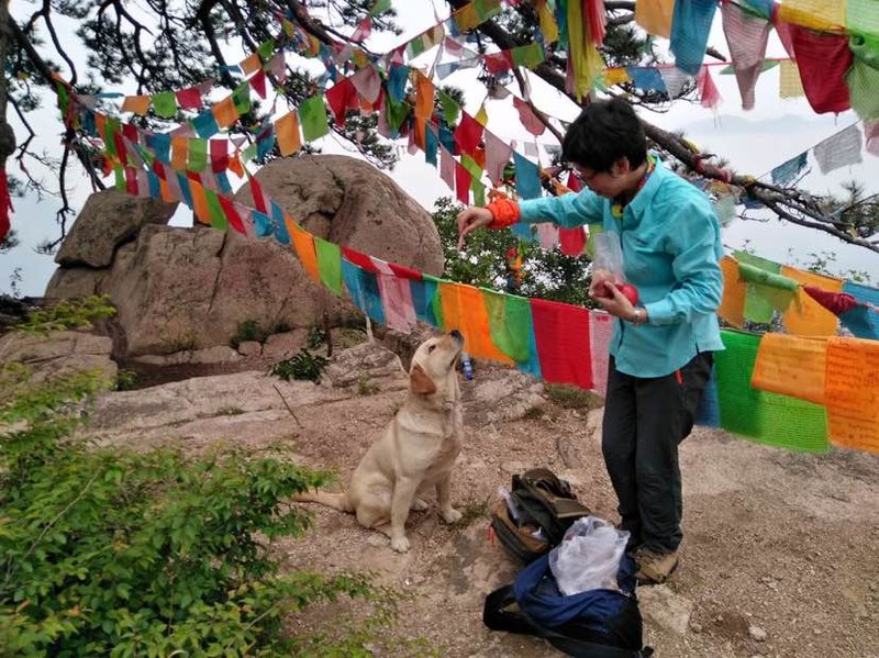 从山顶下来后,大黄狗像来迎接凯旋英雄般在我腿边蹭来蹭去,平时怕狗一直对狗避之唯恐不及的我竟下意识抚摸了它,这示好的举动让大黄狗立刻把我当成朋友,围着我欢快的窜来窜去。我也取出背了一路的火腿肠犒劳引我们成功登顶的功臣。在户外,山水,动物都能那么自然的互动,那么自然的交融,那么自然的成为彼此的朋友。