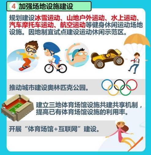 四要加强场地设施建设。规划建设冰雪运动、山地户外运动、水上运动、汽车摩托车运动、航空运动等健身休闲运动场地设施;因地制宜试点建设运动休闲示范区;推动城市建设奥林匹克公园;建立京津冀三地体育场馆设施共建共享机制,提高已有体育场馆设施的利用率;开展“体育场馆+互联网”建设。