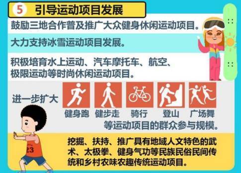 五要引导运动项目发展。鼓励三地积极合作普及推广大众健身休闲运动项目;大力支持冰雪运动项目发展;积极培育水上运动、汽车摩托车、射击、射箭、马术、航空、极限运动等项目;进一步扩大健身跑、健步走、骑行、登山、徒步、游泳、球类、广场舞等运动项目的群众参与规模;挖掘、扶持、推广京津冀具有地域人文特色的武术、太极拳、健身气功等民族民俗民间传统和乡村农味农趣传统运动项目;开发适合儿童青少年、老年人、妇女、职业人群、残疾人等重点人群特点的健身休闲项目。