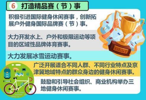 六要打造精品赛(节)事。积极引进国际健身休闲赛事;大力开发水上、户外和极限运动等项目的区域性品牌体育赛事;大力发展冰雪运动赛事;广泛开展适合不同人群、不同行业特点及京津冀地域特点的群众身边的健身休闲赛事;鼓励和引导社会组织、商业机构举办三地健身休闲赛事。