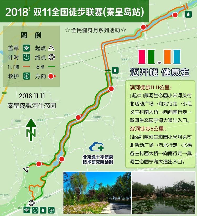 徒步线路:戴河生态园滨河徒步11.11公里和6公里两条长短线路,参与者自由选择。