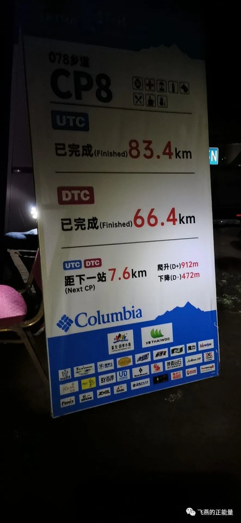 一步一步,我也不知道是怎么熬过这段路的。中间还闹肚子,关了头灯蹲在草丛里解决了。白天吃的太多太杂了,肠胃受不了了。从CP7就开始拉肚子,CP8拉了一次,第三次都没有挺到CP9。